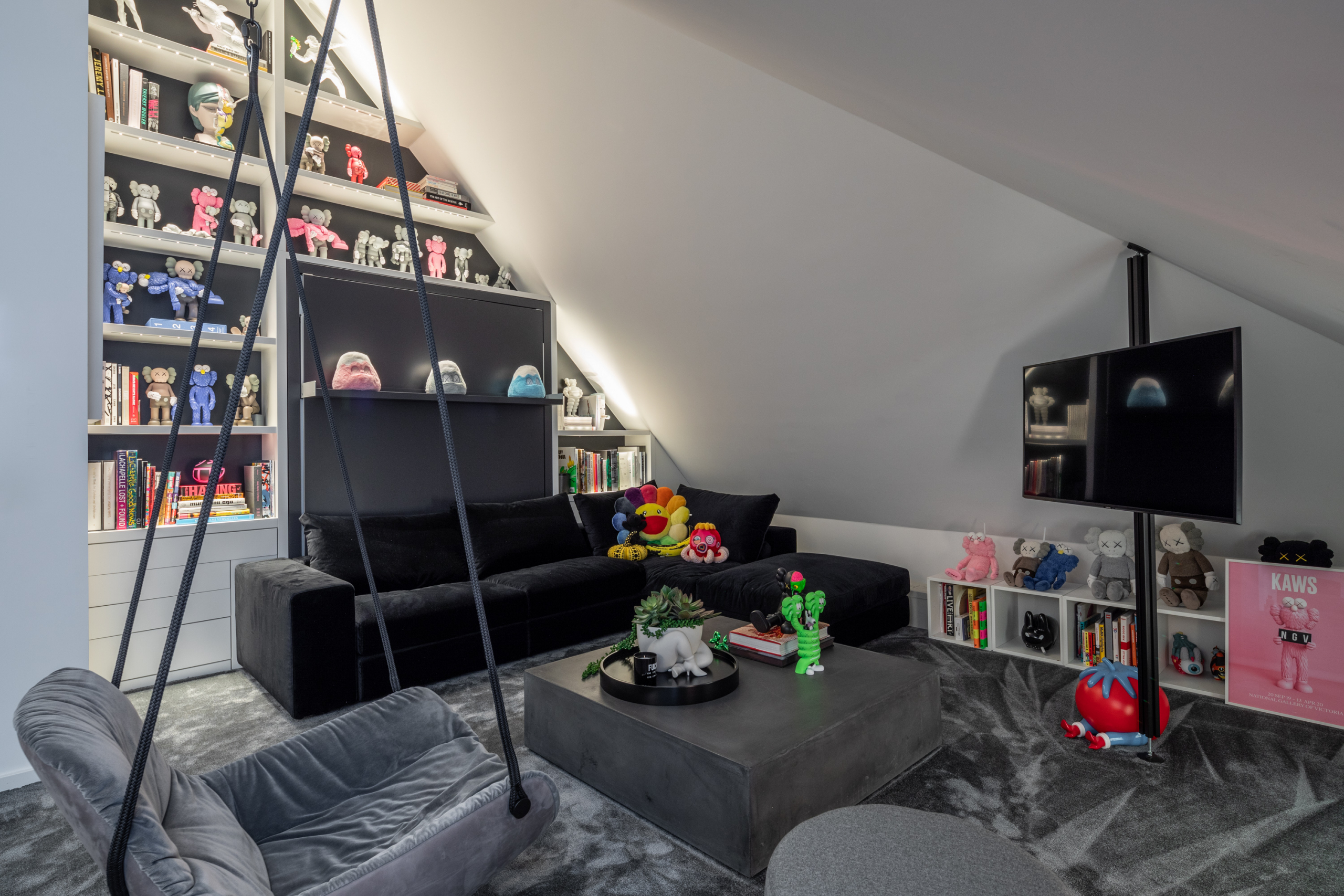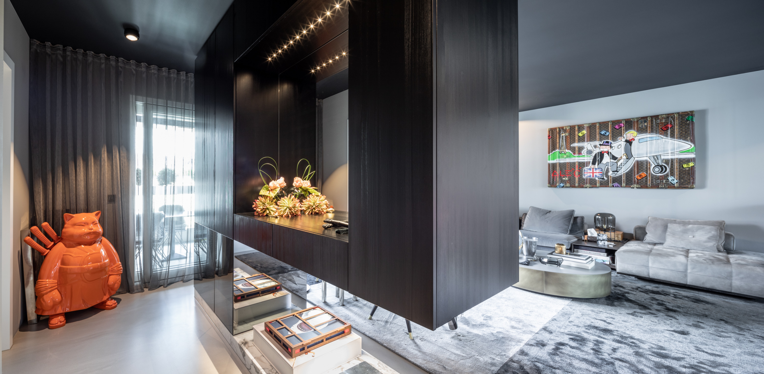 Hochwertige Maßeinbauten wie Schränke und Raumteiler bieten genügend Stauraum.