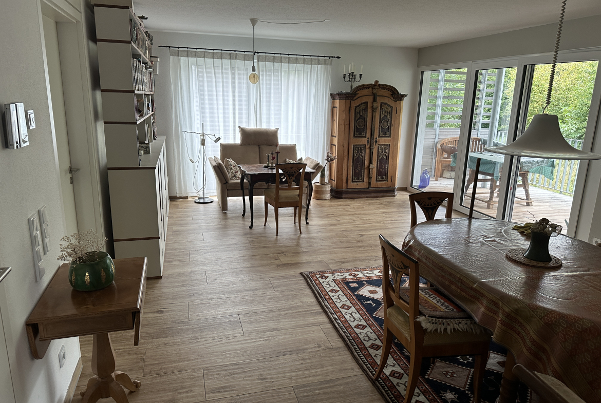 Vom geräumigen Wohnzimmer mit Essbereich haben Sie Zugang auf die Terrasse mit Blick ins Grüne.